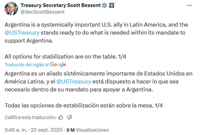 "Argentina es un aliado sistémicamente importante de Estados Unidos en América Latina, y el @USTreasury está dispuesto a hacer lo que sea necesario dentro de su mandato para apoyar a Argentina", señaló en una publicación que realizó en su cuenta de X.
