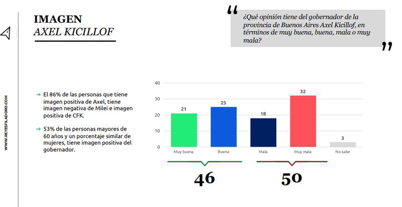 Axel Kicillof, gobernador de la provincia de Buenos Aires, mantiene un nivel similar de polarización en su imagen pública. Su aprobación positiva es del 50%, mientras que un 46% tiene una percepción negativa de su gestión. Estos datos muestran que, a pesar de la dura situación económica y social que afecta al conurbano, tanto Kicillof como Fernández de Kirchner siguen siendo figuras con alto respaldo entre las clases más golpeadas por la crisis.