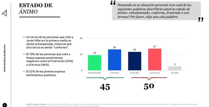 El sondeo también reflejó el estado de ánimo de los votantes. Ante la pregunta "¿Cómo describiría su estado de ánimo?", los resultados fueron variados. Un tercio de los votantes de Milei se describió como "entusiasmado" o "conforme", mientras que el 70% de los votantes de Sergio Massa expresó sentimientos negativos, como "frustración" o "bronca". Entre los jóvenes, sin embargo, predominan los sentimientos positivos, con un 52% mostrando optimismo frente al futuro.