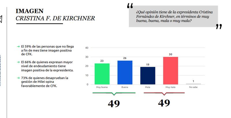 La percepción sobre los líderes políticos también fue tema central de la encuesta. Cristina Fernández de Kirchner sigue siendo una de las figuras más relevantes en el conurbano bonaerense, con un 49% de imagen positiva. Su apoyo es particularmente fuerte entre aquellos que atraviesan dificultades económicas severas: un 59% de las personas que no llegan a fin de mes y un 66% de los endeudados valoran positivamente a la ex presidenta. En contraste, su imagen negativa también alcanza el 49%, con un 30% que la considera "muy mala" y un 19% que la califica de "mala".