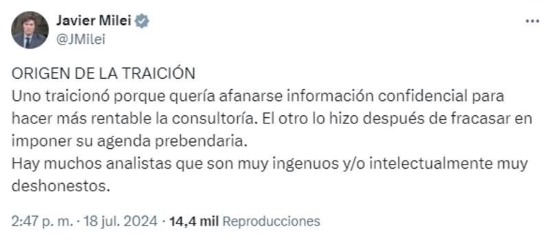Durísimo tuit de Javier Milei: quién sería el segundo "traidor"