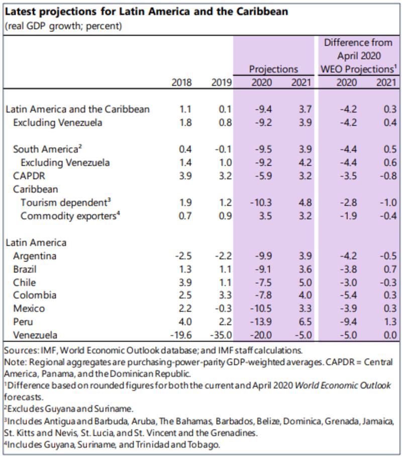 Para la región en general, el FMI proyecta una caída de 9,4% para este año y una recuperación de 3,7% para el año que viene. La peor caída la sufrirá Venezuela, si bien no se contabiliza para el promedio regional, con una recesión esperada por el Fondo de 20% este año y una de 5% del año que viene. Le siguen Perú, con una baja de 13,5%, y México con un retroceso de 10,5%. Según la proyección, Brasil perderá un 9,1% de su PBI, mientras que Colombia caerá 7,8% y Chile, un 7,5%.