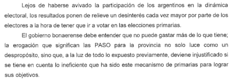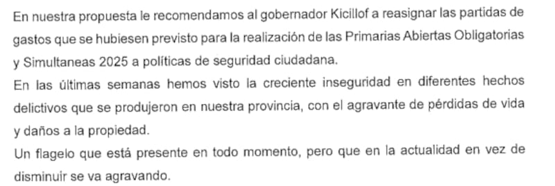 Matías Ranzini y Agustín Forchieri (PRO), en cambio, piden la suspensión de las PASO y en los fundamentos le recomiendan a Kicillof "reasignar partidas a políticas de seguridad ciudadana".