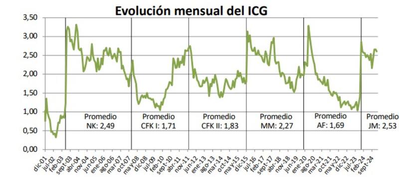 El informe destacó que, aunque el índice descendió ligeramente, el nivel de confianza en enero de 2025 iguala al registrado en enero del año anterior y supera el promedio de 2,53 puntos correspondiente a los 14 meses de gestión de Milei. Además, la diferencia entre el valor máximo y mínimo del ICG durante el período diciembre 2023 - enero 2025 fue de 0,7 puntos, en línea con las fluctuaciones observadas en el primer año de gobierno de Macri (0,68 puntos) y significativamente más reducida que la de Alberto Fernández (1,44 puntos).