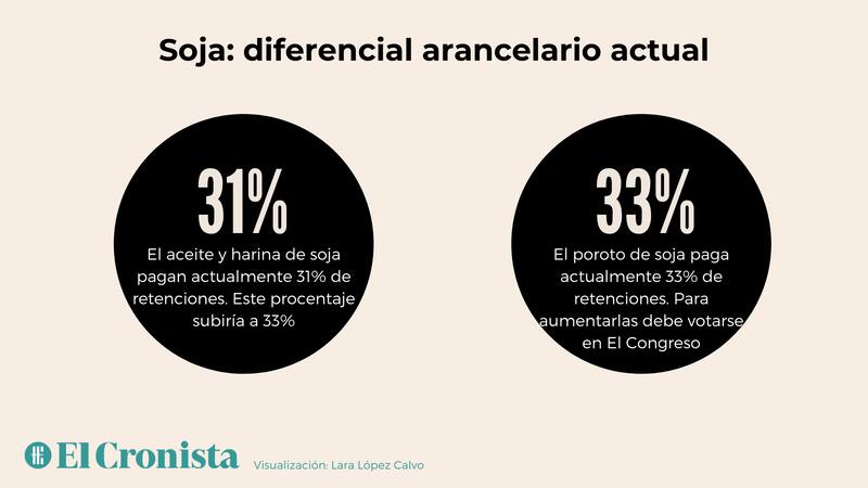 Una suba de las retenciones mayor al 33% debería pasar por El Congreso y, en el caso de ser a través de un decreto, también tiene que ser refrendado por El congreso. Por eso, adelantan que la medida apunta a quitar los diferenciales de retenciones entre el grano de soja y sus subproductos. Una política que ya se había aplicado durante el gobierno de Mauricio Macri.