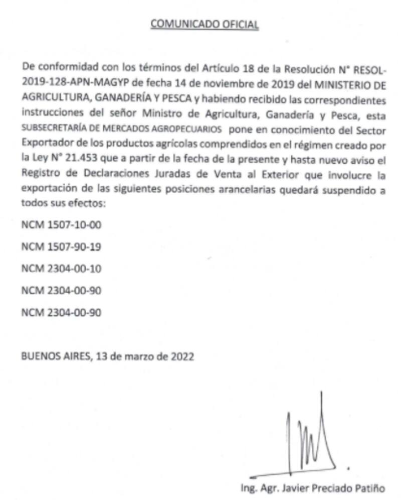A través de un comunicado oficial, y de acuerdo al artículo 18 de la resolución 128 de 2019 del Ministerio de Agricultura de la Nación, se decidió que desde hoy y "hasta nuevo aviso" la suspensión de la aprobación de solicitudes de Declaración Jurada de Operaciones de Exportación (DJE) de subproductos de soja, como la harina y el aceite.