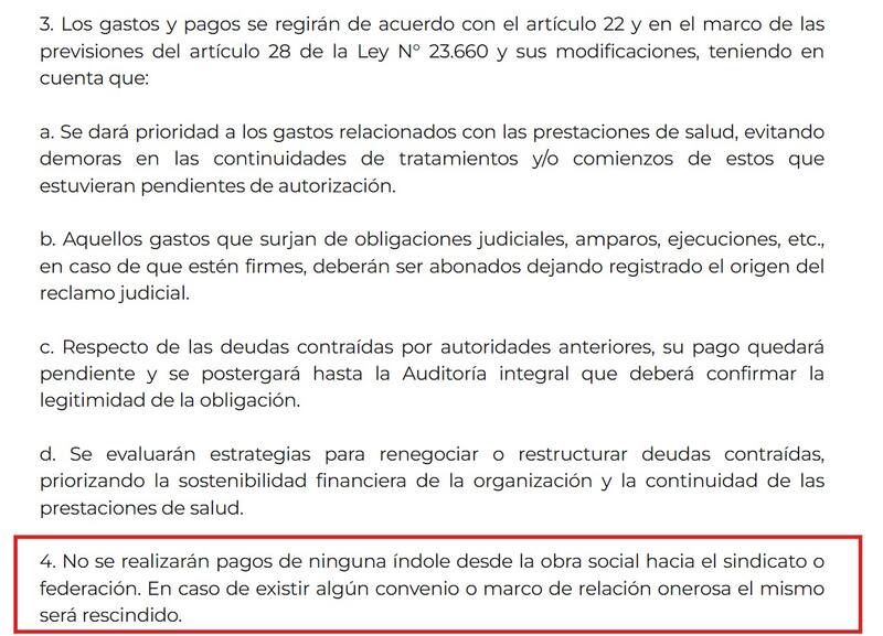 De hecho, en el detalle de procedimientos que fija la Guía se estipulan auditorías y fiscalizaciones que tiendan a sanear los números hasta conseguir un equilibrio en las cuentas. Específicamente en su punto 4, establece que "no se realizarán pagos de ninguna índole desde la obra social hacia el sindicato o federación" y "en caso de existir algún convenio o marco de relación onerosa el mismo será rescindido".