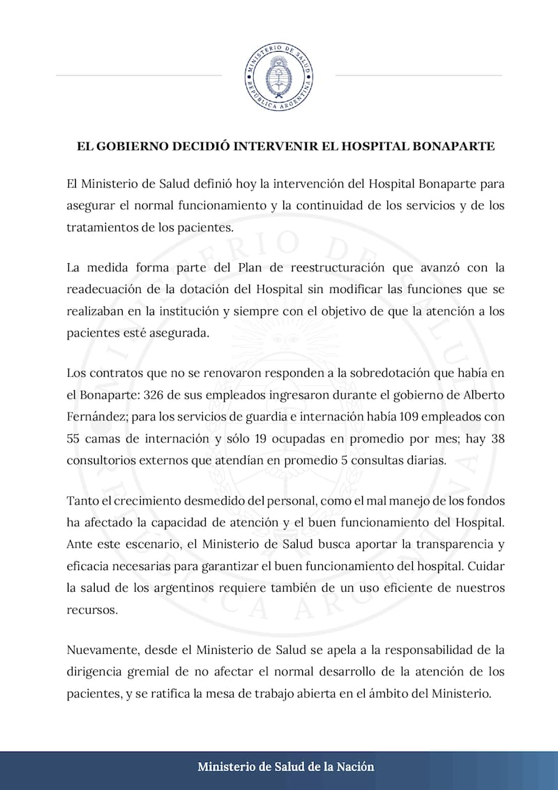 A través de un comunicado oficial, publicado en la red social "X", el Ministerio de Salud informó que esta decisión surge "a partir de la sobredotación encontrada en diferentes servicios del Hospital".