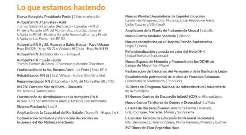 Hasta ahora no hubo resultados concretos. Desde el gobierno bonaerense se quejan de que "hay 1000 obras paralizadas por el Poder Ejecutivo Nacional". Las que creen más urgentes son la reactivación de la Nueva Autopista Presidente Perón y la Autopista Ruta Nacional 3 Cañuelas-Azul, por mencionar algunos.