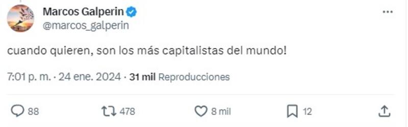 Cuando Milei asumió el pasado 10 de diciembre, Galperin escribió: "Felicitaciones Presidente Javier Milei. Mucha suerte para esta transformación que necesita Argentina para volver al camino del trabajo, el progreso y la generación de valor que nos permitan salir de la decadencia y la pobreza en la que nos hundió el populismo".