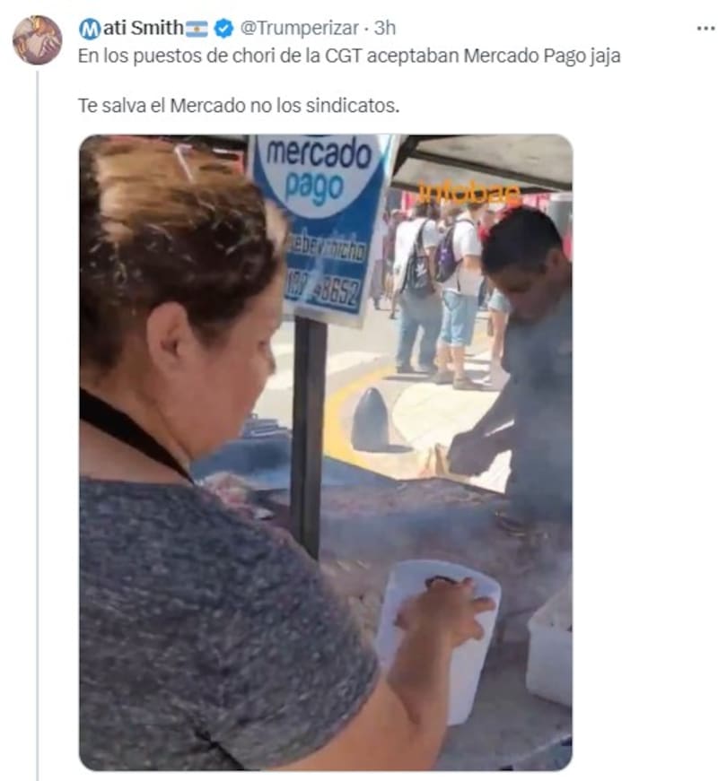 "En los puestos de chori de la CGT aceptaban Mercado Pago jaja. Te salva el Mercado no los sindicatos", escribió el usuario de Twitter que etiquetó a Galperin.