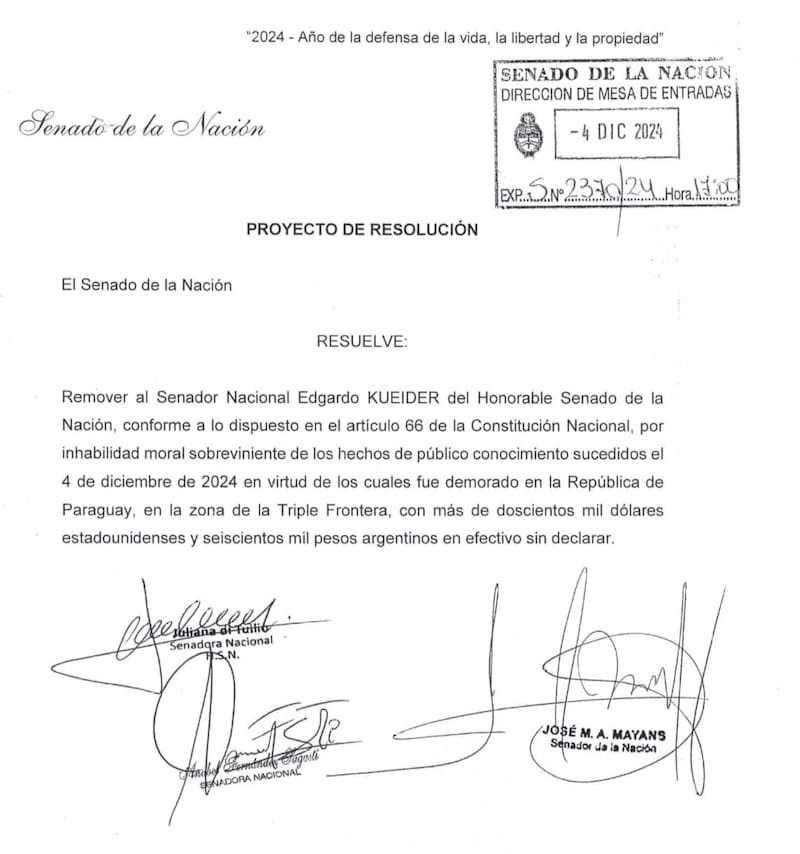 El Interbloque de senadores y senadoras de Unión por la Patria solicitó formalmente la expulsión del senador Edgardo Darío Kueider, invocando el artículo 66 de la Constitución Nacional, tras su detención en Paraguaypor contrabando de divisas. Según las autoridades del país vecino, Kueider ingresó con más de 200 mil dólares y 600 mil pesos argentinos sin declarar, un hecho que calificaron como "punible".}
