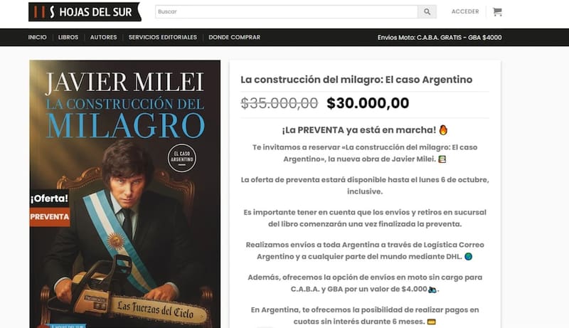Ya está en preventa el nuevo libro del presidente Javier Milei, titulado "La construcción del milagro: El caso Argentino". La obra, editada por Hojas del Sur, recopila discursos y ensayos del mandatario donde, según la editorial, se explican los fundamentos de cada una de las decisiones tomadas desde su asunción, en lo que califica como "el caso de estabilización más exitoso en la historia mundial".