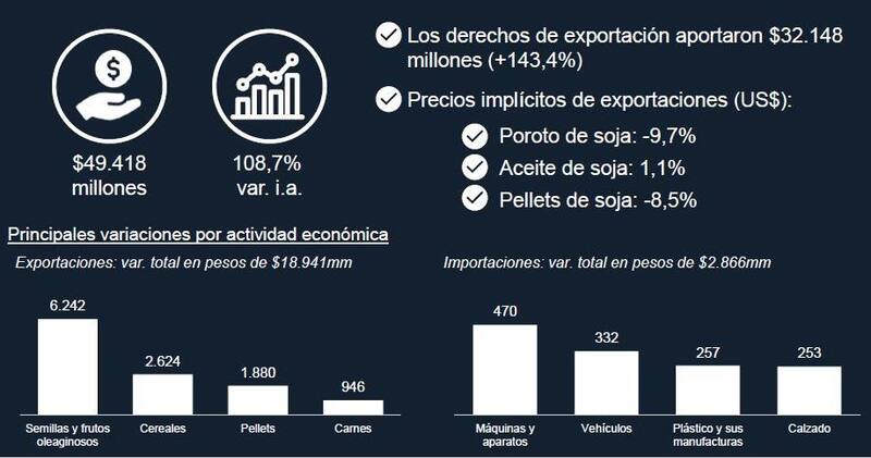 En el comercio exterior, los derechos de exportación crecieron 143,4%, con ingresos por $ 32148 millones, resultado fortalecido por la suba del tipo de cambio y por los derechos de exportación adicionales. Estos últimos impactaron en septiembre por última vez este año.