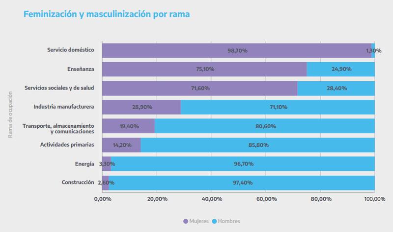 En la construcción los varones son el 96,9%; en la industria manufacturera, el 67,0%; en las actividades primarias, el 87,6%; en el transporte, el 87,4% y en el sector energético, el 90,7%. En estos sectores, las mujeres son minoría.