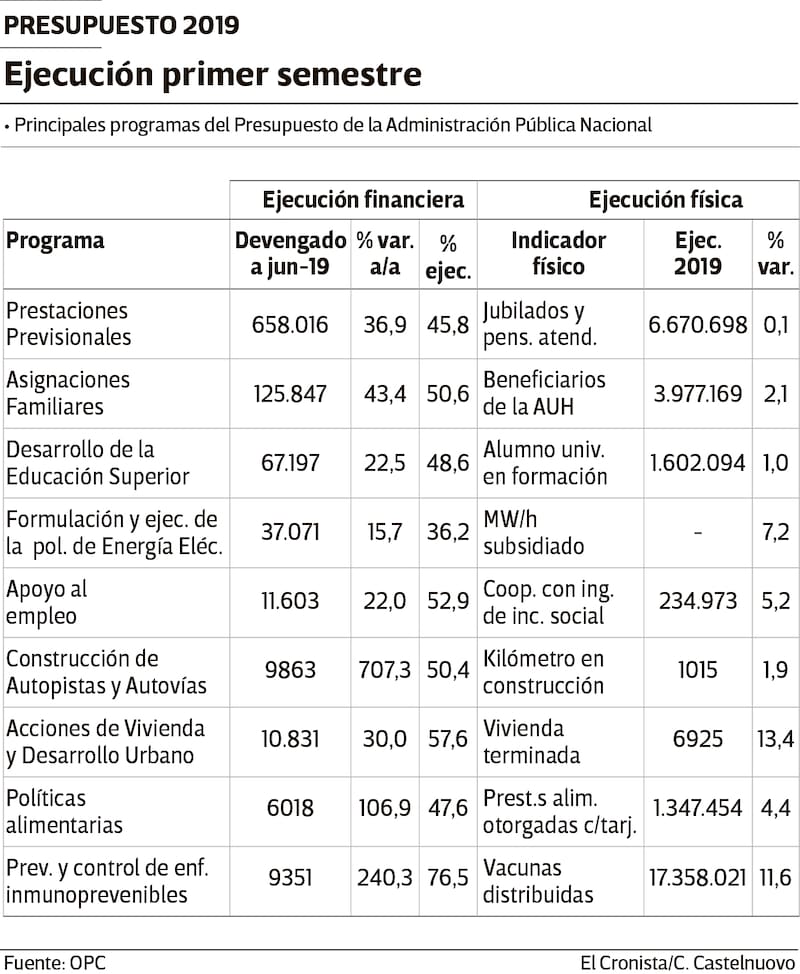 La Oficina de Presupuesto del Congreso de la Nación emitió un informe sobre la ejecución del Presupuesto 2019, que aunque señala que el gasto total devengado en el primer semestre alcanza a poco más del 48% del crédito vigente, está “en línea con los niveles de ejecución de 2018, por lo que el Gobierno nacional está cumpliendo, en promedio, con el devengado de los fondos.