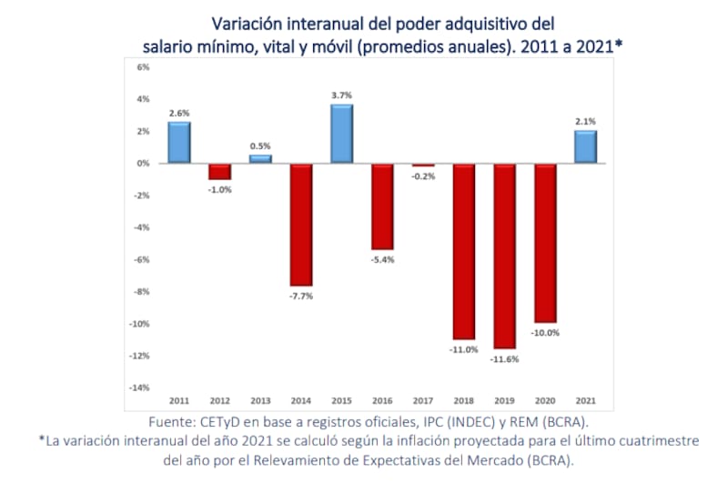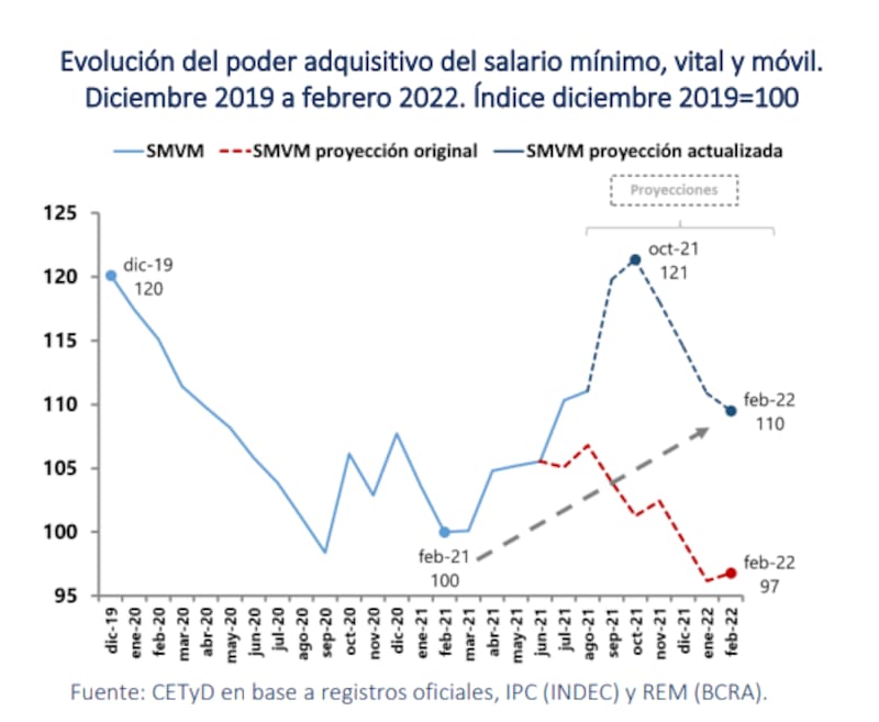 Con los aumentos definidos en la reunión del Consejo Nacional del Empleo, la Productividad y el Salario Mínimo, Vital y Móvil,el poder adquisitivo del salario mínimo se incrementará un 10% entre los meses de febrero de 2021 y 2022. El informe detalló que el valor será superior en un 13% al que hubiera alcanzado de haberse mantenido la progresión que se acordó originalmente (y que hubiera implicado una caída interanual del 3% en febrero de 2022).