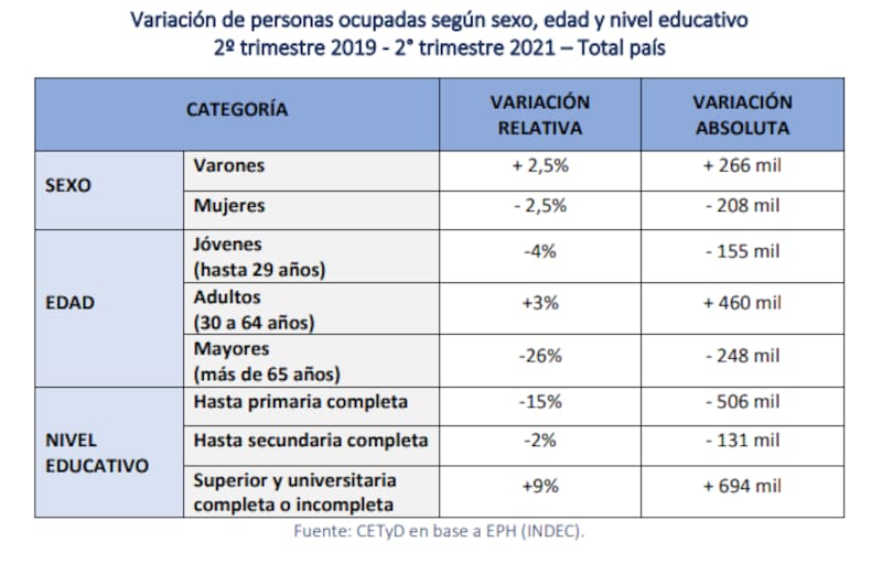 El trabajo informal bajo relación de dependencia es la categoría ocupacional que más se vio afectada por la pandemia, de acuerdo con el estudio. "En el momento más agudo de la crisis, cerca de uno de cada dos asalariados informales había perdido su empleo -indicó-. Y en el segundo trimestre de 2021 aún había 10% menos que en 2019".