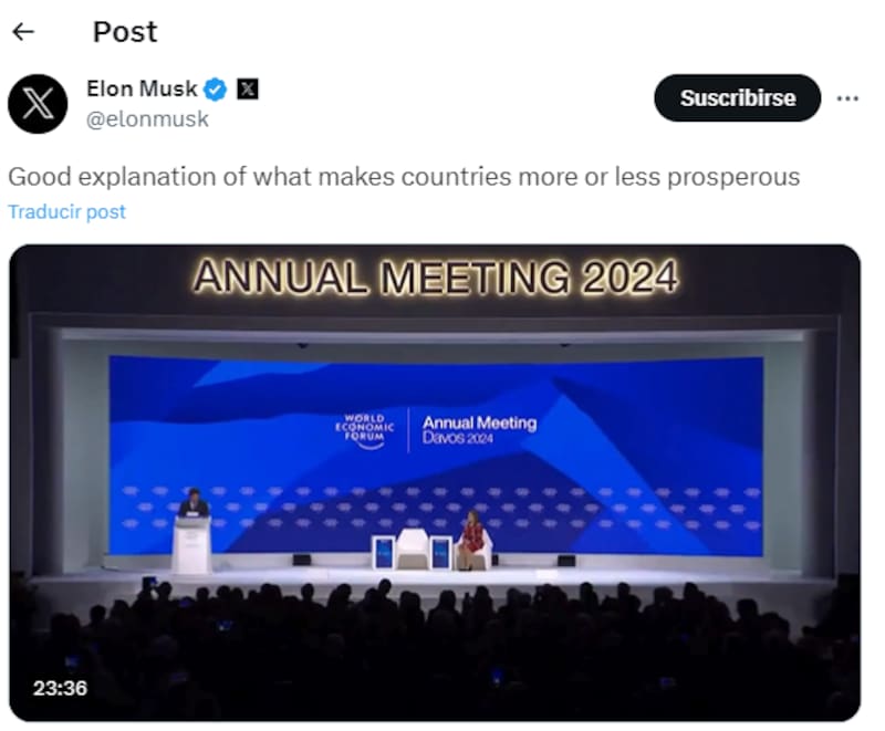 Musk se deshizo en elogios para la exposición de Milei: "Buena explicación sobre qué hace a los países más o menos prósperos". El afamado empresario concluyó que fue "la mejor versión" en oratoria del referente liberal.