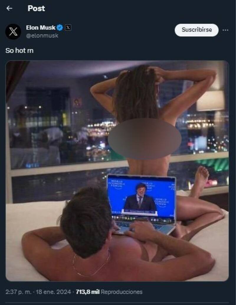 El magnate de la tecnología y dueño de Space X posteó un meme donde se ve a dos personas manteniendo relaciones sexuales y el hombre sostiene una computadora con el presidente de Argentina exponiendo en el foro económico de y la frase: "Muy caliente ahora mismo".