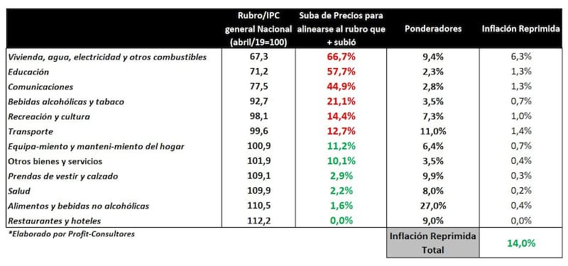 De este se desprende que la inflación reprimida que hoy "amenaza" al Gobierno con nuevas disparadas y que lo obliga a ser delicado con nuevas actualizaciones de los precios regulados totaliza un 14%.