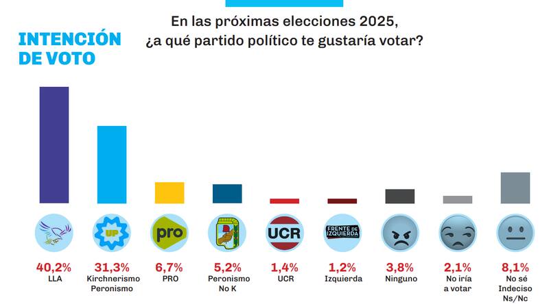 En cuanto a la elección nacional de octubre, el panorama también muestra una ventaja para los libertarios pero más amplia. A nivel país, La Libertad Avanza lidera con el 40,2% de intención de voto, seguido por el kirchnerismo-peronismo con el 31,3%. El PRO, por separado, apenas alcanza el 6,7%, mientras que el peronismo no kirchnerista suma 5,2%. La UCR y la izquierda quedan relegadas con 1,4% y 1,2%, respectivamente.