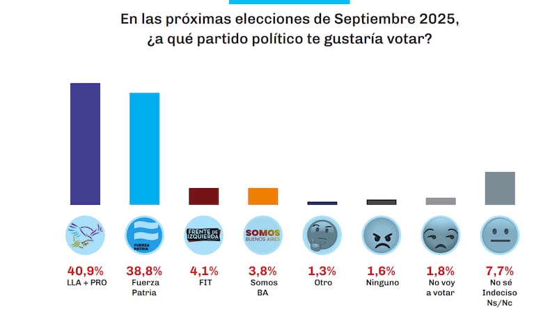 Según la última encuesta de Giacobbe & Asociados, realizada entre el 23 y el 28 de julio de 2025 en la Provincia de Buenos Aires, la intención de voto para las elecciones de septiembre muestra una paridad notable. La alianza entre La Libertad Avanza y el PRO alcanza el 40,9%, mientras que Fuerza Patria -el espacio que nuclea al kirchnerismo y aliados- se ubica apenas por debajo, con el 38,8%. Más lejos aparecen el Frente de Izquierda (4,1%), Somos Buenos Aires (3,8%) y otras opciones menores.