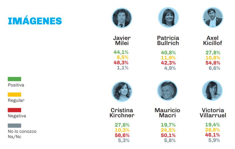 En cuanto a la imagen de los principales dirigentes nacionales, Javier Milei mantiene una imagen positiva del 44,1%, aunque su imagen negativa también es alta: 48,3%. Victoria Villarruel tiene una imagen positiva del 19,7%, una regular del 28,6% y una negativa del 46,1%. Mauricio Macri conserva una imagen dividida (40,8% positiva, 42,3% negativa), mientras que Cristina Kirchner presenta una imagen negativa del 56,6%, y Patricia Bullrich tiene un rechazo del 42,3%, con una imagen positiva del 40,8%.