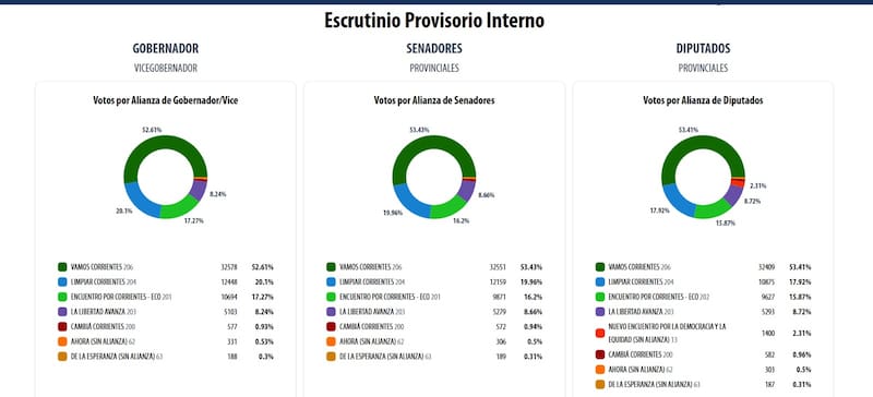 Con un punto porcentual por encima de la media para elegir mandatario provincial, las elecciones legislativas tuvieron a Vamos Corrientes por encima del 53, mientras que la alternativa del PJ obtuvo un 19,96% (senadores) y 17,92% (diputados).