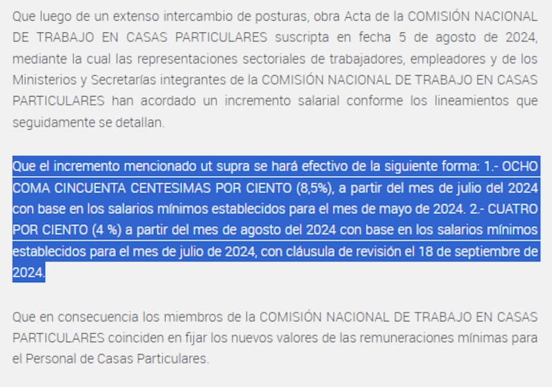"El incremento mencionado ut supra se hará efectivo de la siguiente forma: 1.- OCHO COMA CINCUENTA CENTESIMAS POR CIENTO (8,5%), a partir del mes de julio del 2024 con base en los salarios mínimos establecidos para el mes de mayo de 2024. 2.- CUATRO POR CIENTO (4 %) a partir del mes de agosto del 2024 con base en los salarios mínimos establecidos para el mes de julio de 2024, con cláusula de revisión el 18 de septiembre de 2024", repasó el texto publicado en el Boletín Oficial (BORA). Será la tercera corrección del año luego del esquema iniciado en abril y que ya se tradujo en una mejora acumulada del 62%.
