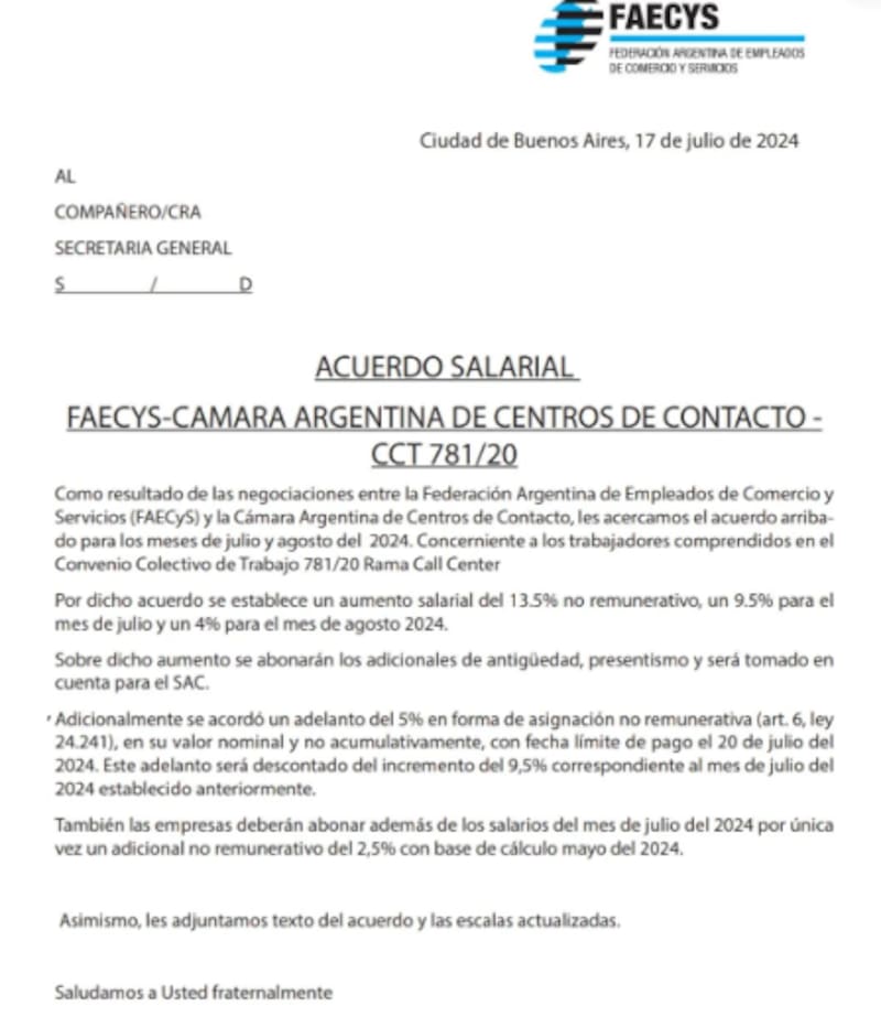 La Federación Argentina de Empleados de Comercio y Servicios (FAECyS) anunció el miércoles el arribo de un nuevo acuerdo salarial con la Cámara Argentina de Centros de Contacto aplicable a los trabajadores de la rama call center.