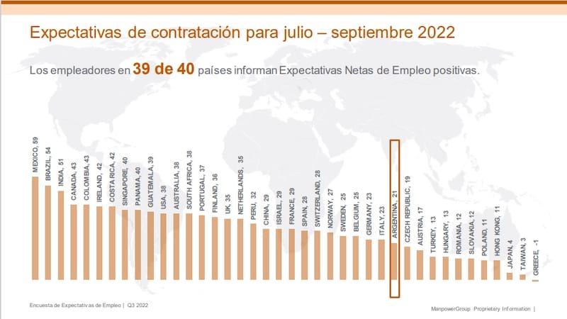 El punto es clave, teniendo en cuenta que países como Colombia, atravesando un proceso electoral de resultado incierto, Perú, con crisis política a nivel del Gobierno central, y Brasil, que ya entra en la campaña electoral de octubre que podría cambiar el signo político en ese país, muestran expectativas de contratación muy por encima de Argentina.