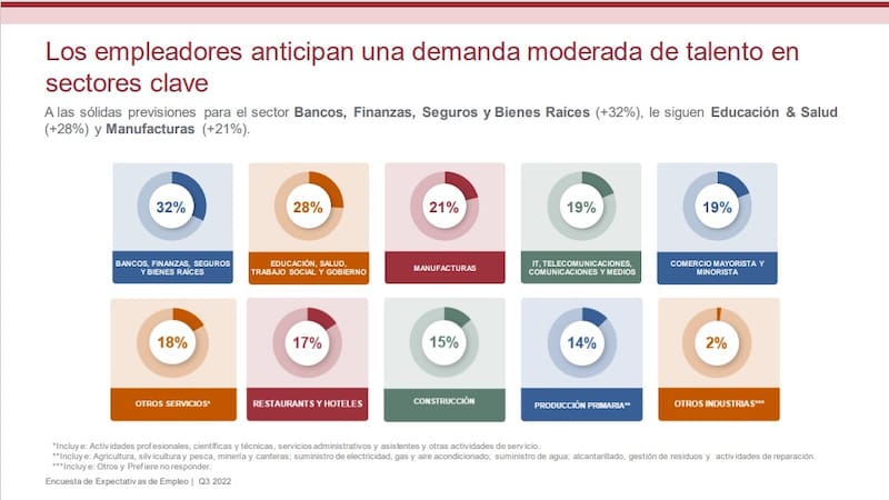 Así, los resultados indican que el 36% de los empleadores consultados tiene previsto aumentar sus dotaciones de personal, mientras que el 19% prevé disminuirlas, el 37% no espera realizar cambios y el 8% restante no sabe qué hará entre los meses de julio y septiembre.
