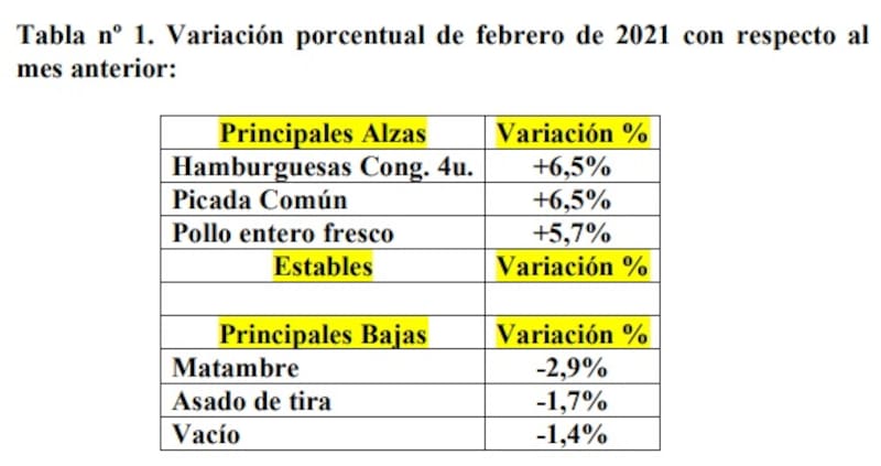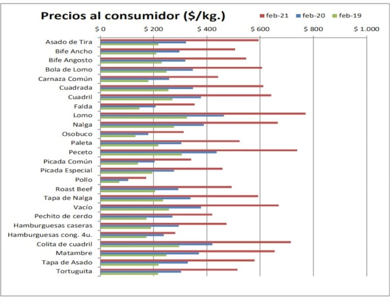 Pero tal vez el dato más preocupante sea la evolución de los precios de los tres cortes en los últimos doce meses. De acuerdo al informe, los cortes vacunos aumentaron en promedio 73,1% entre febrero de 2020 y el mes pasado pero se advierten algunas subas mayores como el caso del asado de tira (84,2%), vacío (76,9%) y tapa de asado (76%).