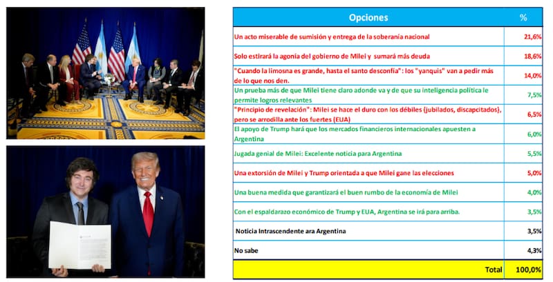 Consultados sobre la promesa de ayuda económica por parte de los Estados Unidos, los bonaerenses tampoco son mayoritariamente optimistas: el 65,7% tiene una valoración negativa, con respuestas que van desde "Un acto miserable de sumisión" a "solo estirará la agonía del gobierno de Milei".
