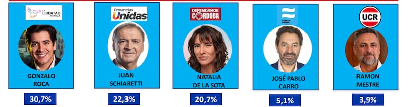 En Córdoba, La Libertad Avanza logra un resultado favorable. Gonzalo Roca (LLA) encabeza la intención de voto a Diputados con un 30,7% (que proyectado sobre indecisos asciende a 33,7%). Lo siguen Juan Schiaretti (Provincias Unidas) con 22,3% (24,5% proyectado) y Natalia de la Sota (Defendamos Córdoba) con 20,7% (22,7% proyectado).