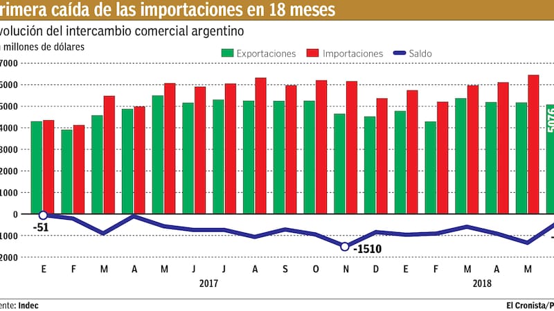 Las importaciones, que acumulaban una suba de 17,9% hasta el mes pasado, cayeron un 7,5% a u$s 5458 millones, la primera baja en 18 meses. En tanto, las exportaciones continuaron con la tendencia negativa y se contrajeron un 1,4%, a u$s 5076 millones.