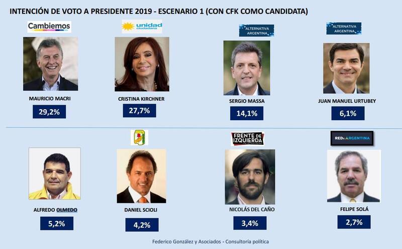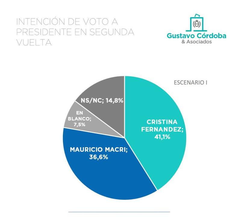 González, por su parte, observa que Macri obtendría en primera vuelta 29,2% y CFK 27,7%. En un eventual ballottage, Macri obtendría 40,2% y Cristina, 37,2%. Sin embargo, todavía hay 15% de indecisos.