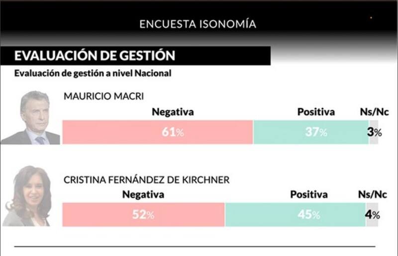 - Para Isonomía, las dificultades de Macri para reelegir se explican por una caída de la imagen positiva al 37% y un alza de las malas impresiones sobre su gestión en torno al 61%.