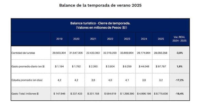 De acuerdo a los datos relevados por el sector Turismo de CAME, la temporada finalizó con 28,1 millones de turistas recorriendo el país, con un impacto económico de $ 8,7 billones, lo que representa una caída del 19,4% frente a la temporada 2024.