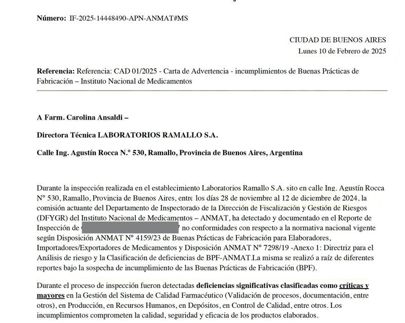 Por otra parte, el 13 de mayo se dictó la Disposición 3158/25, que inhibió la producción de la planta bonaerense de HLB Pharma "hasta que se hallen las condiciones técnicas y sanitarias" para levantar esa medida.
