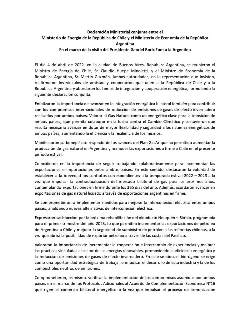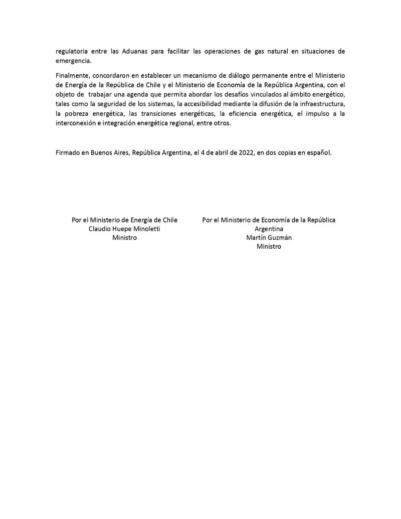 En esta tarea se enfocaron, entre otros, el ministro de Economía, Martín Guzmán; la vicejefa de Gabinete, Cecilia Todesca; el secretario de Energía, Darío Martínez; la subsecretaria de Hidrocarburos, Maggie Luz Videla Oporto; y el nuevo ministro de Energía de Chile, Claudio Huepe Minoletti, que llegó con la comitiva del flamante presidente trasandino, Gabriel Boric Font.