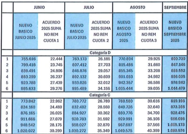 El mismo establece aumentos escalonadosy pagos adicionales entre junio y agosto de este año. Las sumas, que van de los $ 22.000 a los $ 60.000 (dependiendo el mes y la categoría del trabajador), no tendrán incidencia en adicionales, aportes ni contribuciones, y se liquidarán liquidarse bajo los siguientes conceptos: