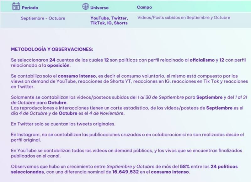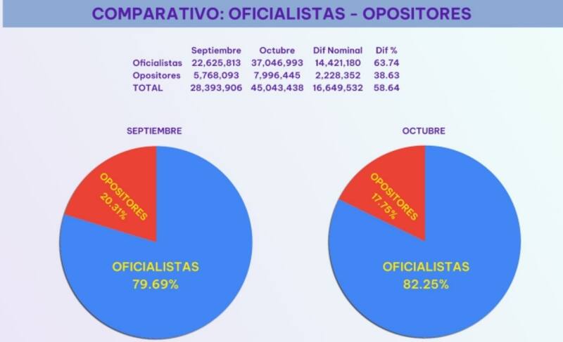 Aquí se marcó también una diferencia clara en favor de los políticos oficialistas: mientras que sus interacciones de mes a mes se incrementaron un 63,7%, las de los opositores lo hicieron en un 38,6%.