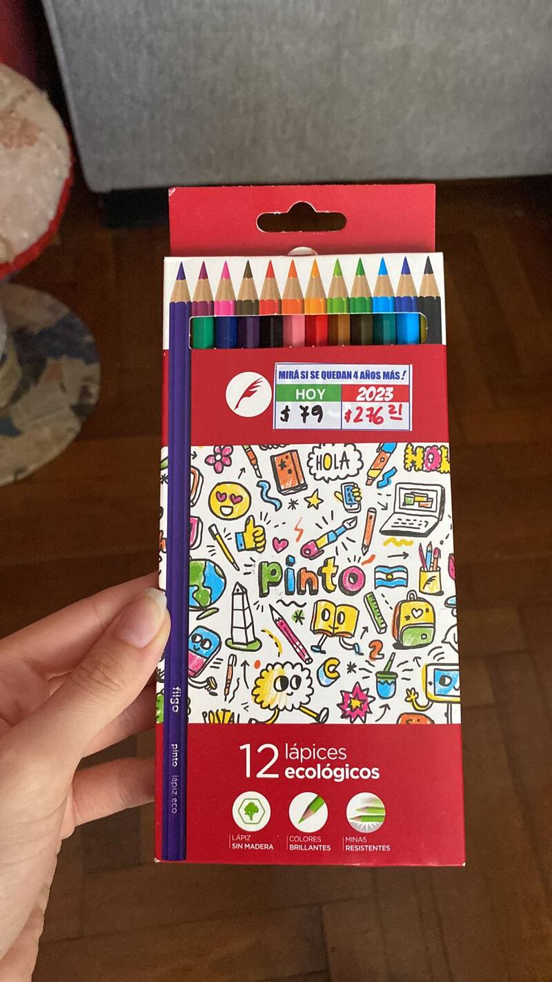 Una caja igual con los mismos lápices que se vendía a $ 79 hoy no se vende a $ 276 sino que ronda los $ 339 en mayoristas. Por unidad el precio es aún mayor. En librerías su precio varía entre ofertas por $ 449 y los $ 695. En Mercado Libre se pueden conseguir con un precio inicial de $ 635, $ 710, $ 764 o hasta $ 1100 en 6 cuotas de $ 183.33.