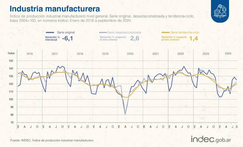 La industria cayó 6,1% interanual en septiembre de 2024 y creció 2,6% respecto del mes previo.