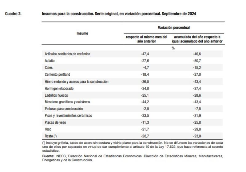 Por su parte, si se analizan las variaciones del acumulado durante los nueve meses de 2024 en su conjunto con relación a igual período del año anterior, se observan bajas de 50,7% en asfalto; 43,4% en mosaicos graníticos y calcáreos; 43,4% en hierro redondo y aceros para la construcción; 40,6% en artículos sanitarios de cerámica; 37,4% en hormigón elaborado; 31,9% en pisos y revestimientos cerámicos; 29,8% en yeso; 28,6% en ladrillos huecos; 27,0% en cemento portland; 25,8% en placas de yeso; 23,0% en el resto de los insumos (incluye grifería, tubos de acero sin costura y vidrio para construcción); 15,2% en cales; y 7,5% en pinturas para construcción.