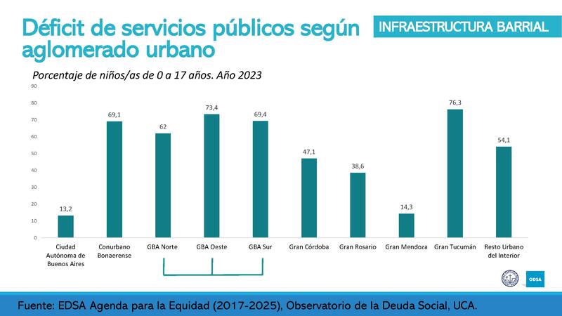 Más de la mitad de la población de niños, niñas y adolescentes carecen en sus hogares de al menos una de las siguientes privaciones: alumbrado público, recolección de basura, pavimento o empedrado, vereda cubierta con materiales resistentes (baldosa, mosaico, cemento, etc.), desagües pluviales (alcantarillas, sumideros).