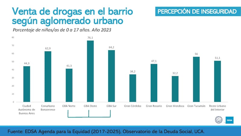 Al mismo tiempo, un 42% reside en barrios en los que carecen de suficiente vigilancia policial, y 54,4% en barrios en los que se reconoce la existencia de venta de drogas . La inseguridad en el barrio es muy alta, pero está por encima de la media en los estratos sociales medios (medio obrero integrado y medio no profesional). Todo esto se potencia en el Conurbano Oeste y Gran Córdoba, Gran Mendoza y Gran Tucumán.