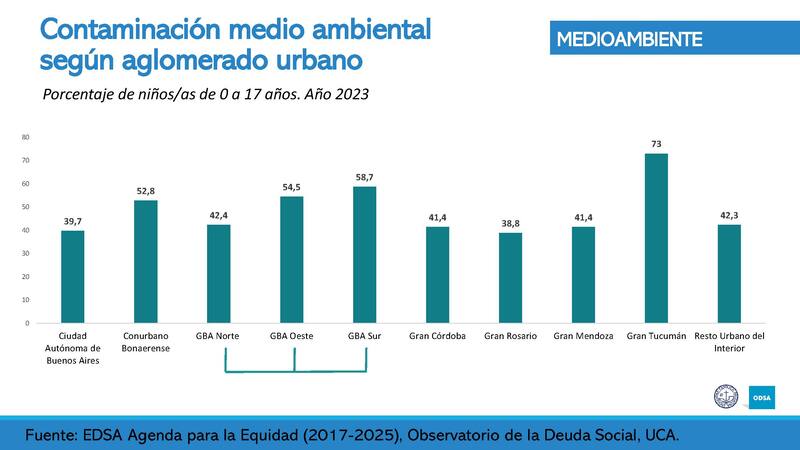 La desigualdad social agrava estas privaciones ambientales, especialmente para los niños/as y adolescentes más desfavorecidos económicamente. Esta situación se evidencia con mayor crudeza en el Conurbano Bonaerense y el Gran Tucumán, aunque las disparidades también existen en otros entornos urbanos, como detalla el informe.
